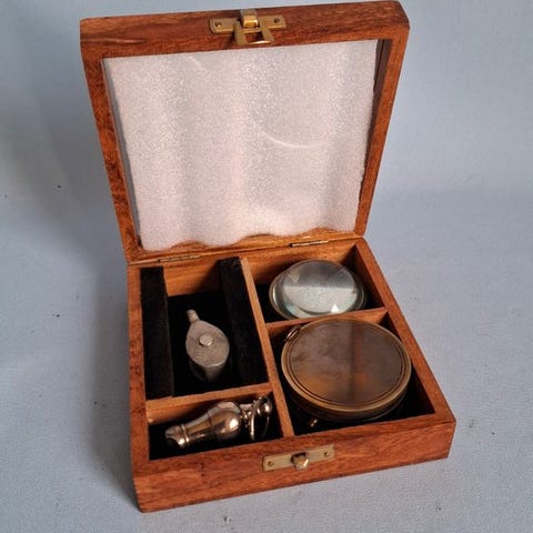 Kaunis koristeellinen setti merenkulkutarvikkeita puisessa laatikossa.Kyseessä on toimiva kompassi, suurennuslasi, katrol ja huilu.Tässä tapauksessa kuvat kertovat enemmän kuin kuvaus. Tästä syystä lisätty runsaasti kuvia.Kuvat ovat osa kuvausta. Setti pakataan erittäin huolellisesti, kirjatulla ja vakuutettuna lähetettäväksi seuranta- ja jäljitysvirran kera.Katso myös muut kohteeni ja voit mahdollisesti säästää postikuluissa.Ei lähetetä Yhdysvaltoihin.