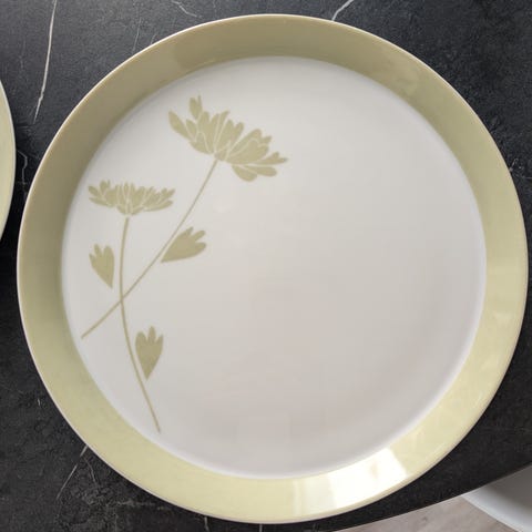 Hakusanat: keittiötarvikkeet, kukkakuvio, vihreä reunus, posliinilautaset, fontana, astiat, Paketoitava, Valmistaja