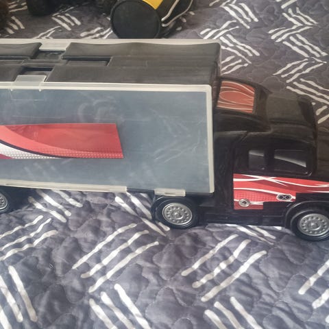 Ominaisuudet: Siinä on neljä tasoa, avattavat sivupaneelit ja sisäänrakennettu ramppi ohjaamossa, jota pitkin autot voivat ajaa ulos. Toinen sivupaneeli vähän murtunut, näkyy kuvassa.