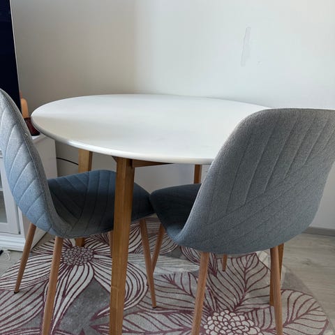 Tuolit vaativat ruuvien kiristyksen. Muuten moiteeton pöytä plus tuolit.