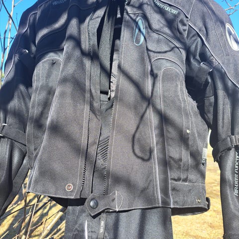Ylimääräiseksi jäänyt ajotakki. Kelien mukaan säätövaraa voi hakea vetoketjukiinnitteisestä sisävuoresta. Siisti ja ehjä takki. Koko L.