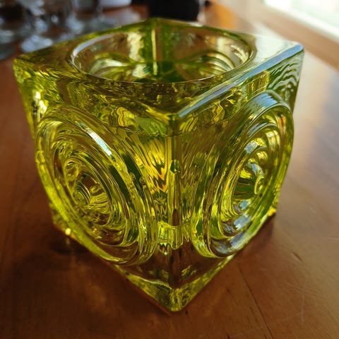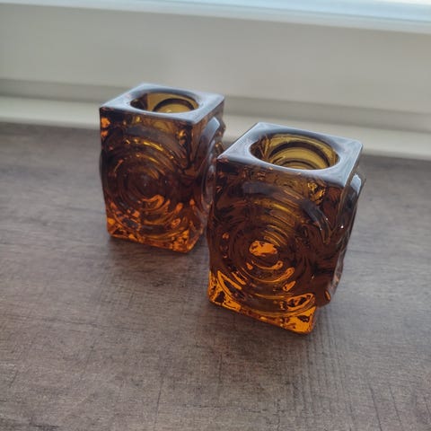 Riihimäen Lasin valmistama Rengas-kynttilänjalka, jonka on suunnitellut Tamara Aladin vuonna 1971.