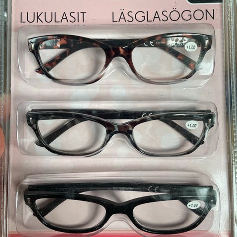 Lukulasit miehet +3.0 Kehykset ovat mustaa muovia ja suorakaiteen muotoiset. Myynnissä useampi saman tyylinen kehys. Sopivat käytettäväksi esimerkiksi arki- tai lukulaseina linssien vahvuuksien mukaan. Merkkitietoa tai tarkkoja mittoja ei ole saatavilla kuvien perusteella. Koko sarja 10€