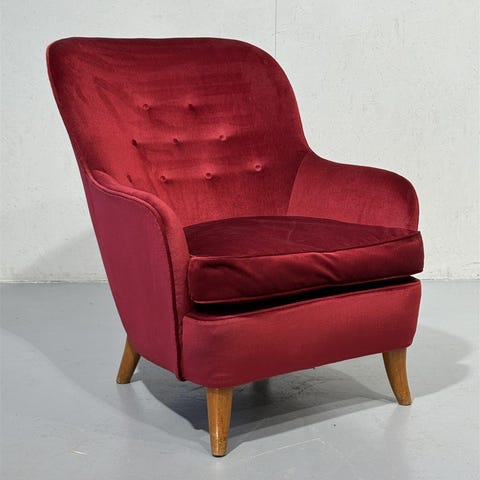 Punainen samettiverhoiltu nojatuoli 1900 luvun puoliväliä, jossa on napitettu selkänoja ja puiset jalat. Oletettavasti Runar Engblom design ja alkuperäisesti Hotelli Vaakuna kalustoa. Istuinkorkeus 40cm. Pehmusteet ovat mukavat ja istuinosa on irrotettava.