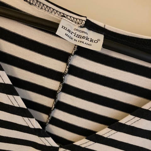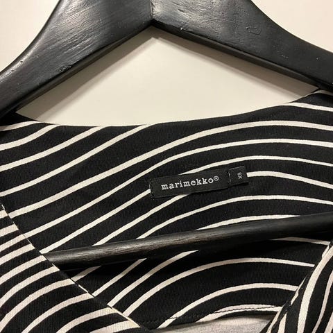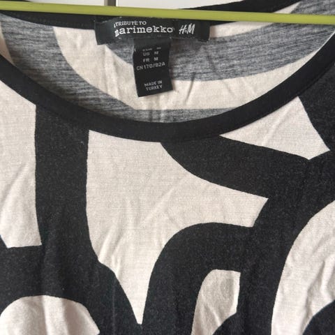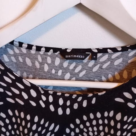 Marimekko naisten paita, koko M. Väri valkoinen mustalla aaltokuviolla. Materiaali puuvillaa. Paidassa on pyöreä pääntie ja noin 3/4-pituiset hihat. Sopii arki- ja vapaa-ajan käyttöön.