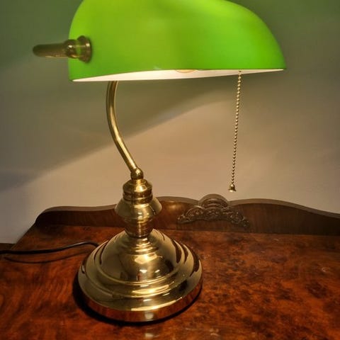 Notaarilamppu, jota kutsutaan myös pankkilampuksi.Kestävä metallijalka kiiltävässä messinkissä, kaartuva varsi ja vihreä lasi.Vetokytkimellä helposti käytettävissä.Lämpöä antavaa valoa.Korkeus 38 cm.Varjostimen leveys 23 cm.Paino 1,0 kg.Lamppu pakataan turvallisesti polystyreenivaahtoon ja toimitetaan seurattavalla track&trace-palvelulla.