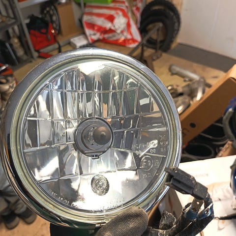 Moottoripyörän ajovalo, pyöreä malli. Krominvärinen metallikuori ja lasinen etulasi. Valossa kiinnityskorvake ja johdotus liittimineen. Sopii esimerkiksi vanhempiin tai custom-moottoripyöriin ajovaloksi tai projektikäyttöön. Tarkemmat mitat ja tehotiedot kannattaa varmistaa omien tarpeiden mukaan. Tämä taitaa olla peräisin Suzuki GT125:sta.