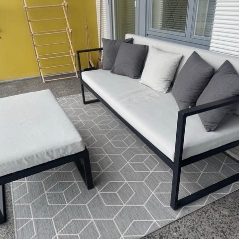 Rungon väri musta ja pehmusteet vaalean harmaa/beige. Lisäksi irtokoristetyynyt, jotka ei kuvassa. Ovh 1095€.