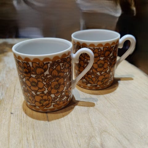 Japan-merkitty sinikuvioitu kahvikuppi ja aluslautanen posliinista. Kuppien kyljessä on sinisävyinen kukkakuvio ja valkoinen sisäpuoli, aluslautaset ovat valkoiset. Sopii kahvin tai teen tarjoiluun. Valmistusmaa merkitty pohjaan tekstillä "Japan".