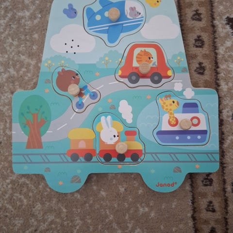 Meille käytettynä ostettu paloautoaiheinen Janod merkkinen palapeli. Paloja 24 kappaletta ja juliste, missä aihe. 3+.
