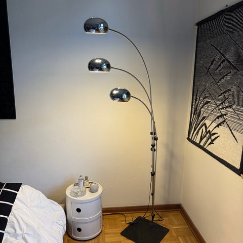 Viisihaarainen lattiavalaisin. Jalusta painavaa marmoria.