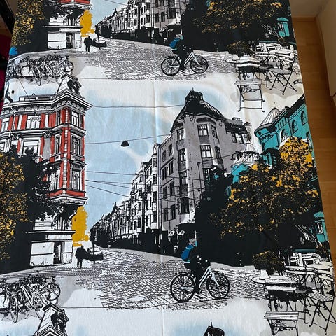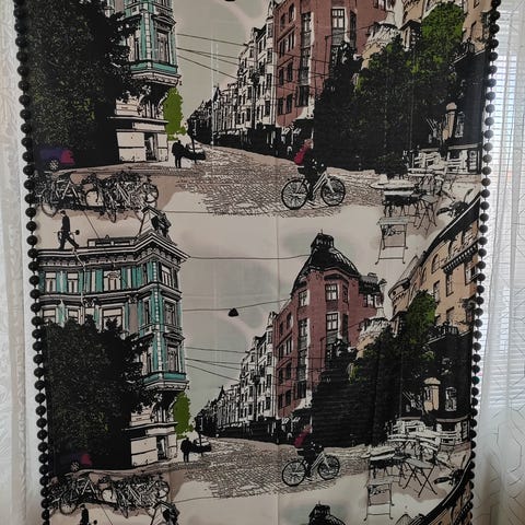 Valmisverhot jotka on lyhennetty 218cm pituisiksi. Lyhennys tehty kääntämällä niin että verhon pystyy muuttamaan alkuperäiseen mittaansa. Pujotuskuja.