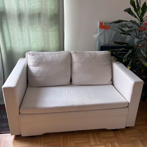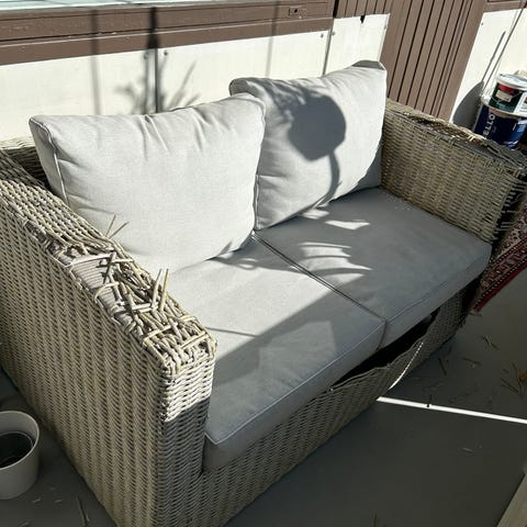 Noin 140cm parveke sohva. Ollut lasitetulla parvekkeella. Kahden istuttava. Päällisen voi irrottaa ja pestä.