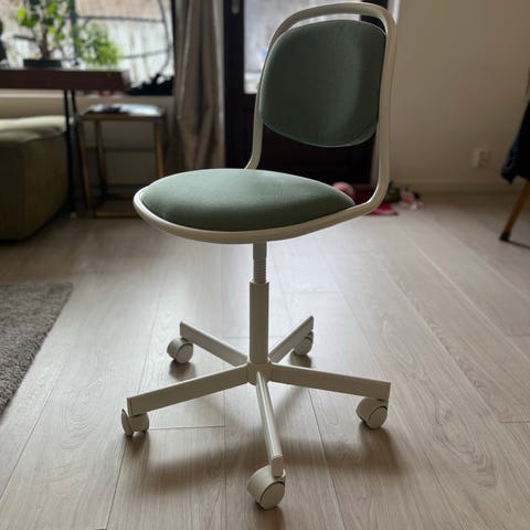 IKEA lasten tuoli, jossa vaaleanpunainen kangasistuin ja -selkänoja sekä valkoinen runko. Tuolissa on pyörällinen, ristikkomallinen jalusta, joka helpottaa liikkumista työpöydän ääressä. Soveltuu lapsen työ- tai askartelupöydän tuoliksi sisäkäyttöön. Korkeus säädettävissä. Uudenveroisessa kunnossa.