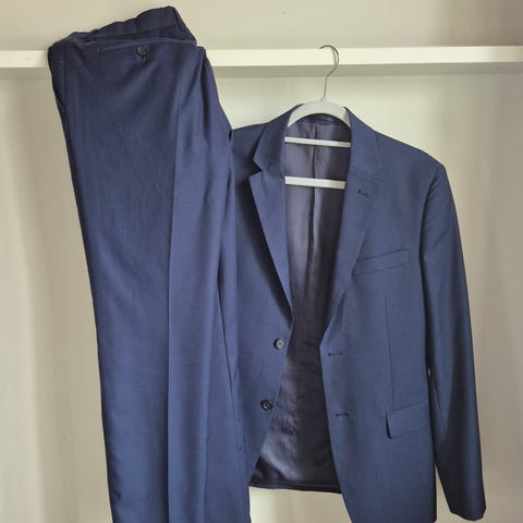 Haloselta ostettu nuorten miesten tummansininen puku. Ostettu 167cm/50kg käyttäjälle. Create men merkki.