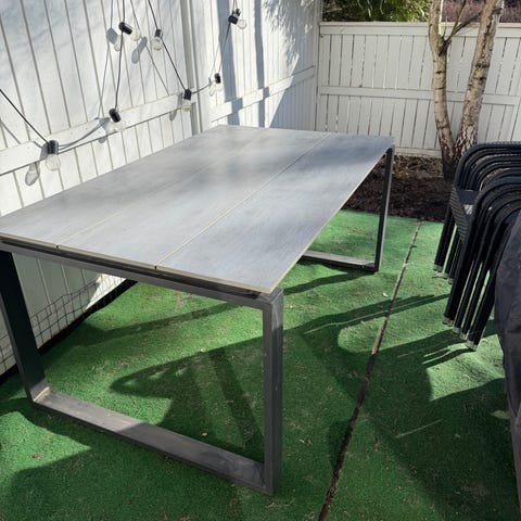 Ruokailuryhmä on moitteettomassa kunnossa. Ollut yhden kesän, eli viime kesänä ostettu. Myydään siksi koska tuo tumma väri ei ollutkaan ihan se mitä nyt halutaan, vaan hankitaan puinen ruokailuryhmä tämän tilalle.