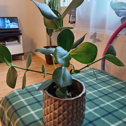Viherkasvi muoviruukussa. Kasvilla on useita versoja ja suuret vihreät lehdet. Sopii sisätiloihin huonekasviksi. Kasvi on istutettu multaan ja sitä voidaan tarvittaessa siirtää isompaan ruukkuun kasvuolosuhteiden parantamiseksi.