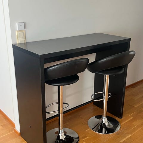 Myydään baaripöytä ja tuolit uuden ruokailuryhmän tieltä. Sopii hyvin esimerkiksi pieneen asuntoon. Kunto erinomainen.