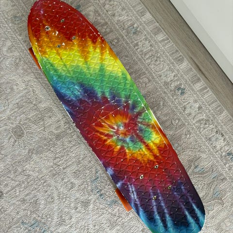 Cruiseri monivärisellä kannella. Laudassa on värikäs grafiikka pohjassa ja musta grippi päällä. Etupyörät ovat vihreät ja takapyörät punaiset. Laudassa on metalliset trukit ja standardit kiinnitysreiät. Sopii yleiseen skeittaukseen esimerkiksi kadulla tai rullailuun tasaisilla alustoilla.