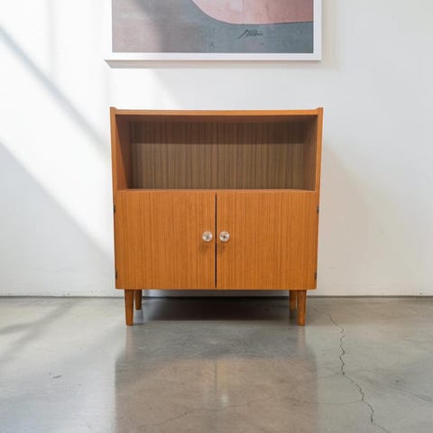 Kapea vintage teak hylly kaapilla. Avo-osassa hyllylevy ja alaosassa lukollinen kaappi. Avo-osan hyllylevyn saa pois ja kaappiin on avain.