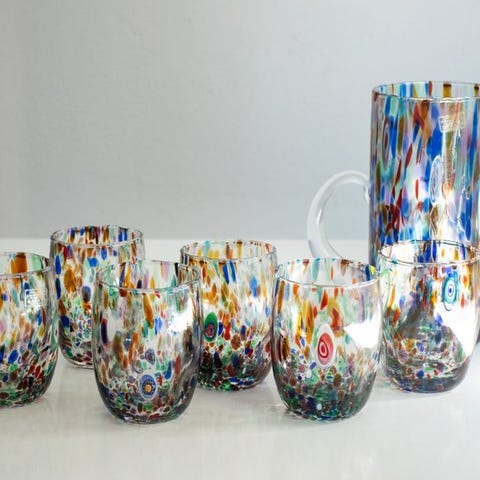 Arkipäiväinen ele kuten juoda lasillinen vettä voi tulla ainutlaatuiseksi, kun pidät käsissäsi mestarin tekemiä taideteosta, jolla ei puuttunut luonnetta ja persoonallisuutta. Juhlistasi tulee vieläkin juhlavampi, kun cocktailisi tarjoillaan Ribes the Art of Glass -laseista. Tässä laseissa on venetsialaisen mestarin allekirjoitus ja ne on valmistettu Muranolla käyttäen macchiette- ja murine-vanhaa venetsialaista tekniikkaa, joka vie meidät vuosisatojen taakse, jolloin Venezia pullisteli taiteilijoita, käsityöläisiä, herra- ja mecenattiläsukyliä, jotka hallitsivat koko Eurooppaa. Resistant and dishwasher safe. Täydellinen lahjaidea. Ne on valmistettu murine-tekniikan ja canne-tekniikan sekä Murano-lasista, jota on jäänyt suurempien vesiastiaiden valmistuksesta. Nämä lasit kuuluvat kokoelmaan, joka on omistettu niille, jotka haluavat ostaa kestäviä tuotteita ja joiden vaikutus ekosysteemiin on mahdollisimman pieni, sillä niissä käytetään myös vähemmän kaasua ruoanlaittoon eikä niistä pääse fluorideja ilmakehään. complete di caraffa. Lasit ovat kestäviä ja ne voi pestä astianpesukoneessa. Ei massatuotantoa.