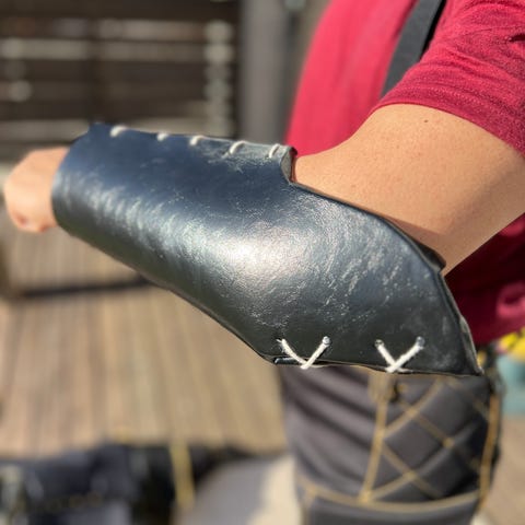 Musta HEMA-tyylinen polyeteenimuovista valmistettu olkasuoja. Tämä olkasuoja koostuu kahdesta saranoidusta muovilevystä, jotka suojaavat olkapäätä ja olkavartta. Se kiinnitetään pehmeään suojavarusteeseen tai muuhun vastaavaan varusteeseen hihnojen ja solkien avulla. Sopii historialliseen miekkailuun, roolipeleihin tai muihin kevyisiin harjoittelutarkoituksiin, kuten käyttäjän henkilökohtaisten suojavarusteiden täydennykseksi.