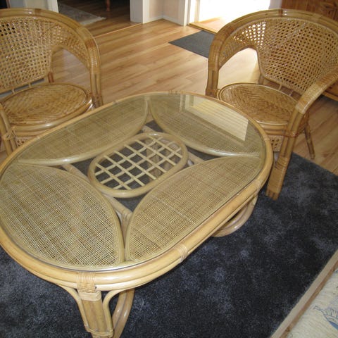 Myydään rottinkiryhmä. Pöytä ja kaksi tuolia.