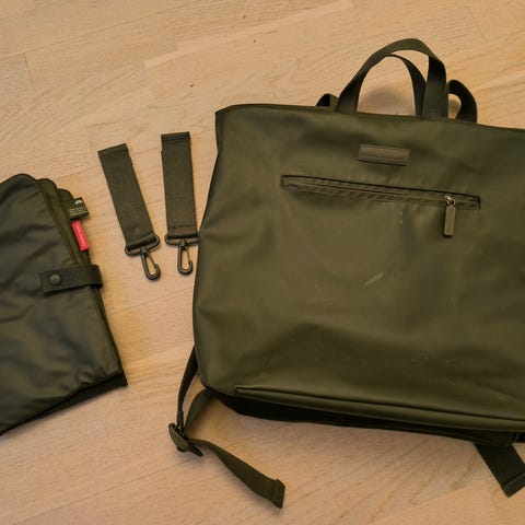 Skip Hop hoitoalusta vauvalle, jossa useampi tasku johon saa vaihtovaipat, puhdistuspyyhkeet ja vaikkapa yhdet vaihtovaatteet pakattua mukaan. Todella näppärä, jos ei aina halua kantaa isoa hoitolaukkua mukana. Voi myös ripustaa esim. vaunuihin soljen avulla. Vaihtoalusta irrotettavissa säilytystaskuista vetoketjulla. Mukana myös rasia puhdistuspyyhkeille.