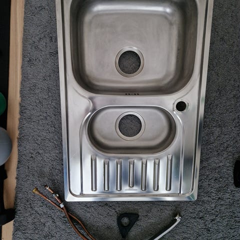 Ruostumattomasta teräksestä valmistettu keittiön tiskipöytä, jossa on kaksi allasta ja hana. Altaat on sijoitettu peräkkäin pitkittäissuuntaisesti. Tiskipöydän alla on valmiit poistoliitäntöjen lähdöt ja kupariputket vesiliitäntöjä varten. Sopii keittiöön tai kodinhoitotilaan, jossa tarvitaan ruostumattomasta teräksestä valmistettu kaksoisallas hanalla.