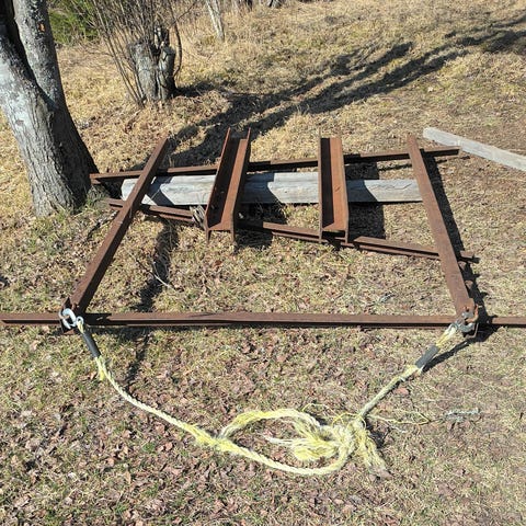 Metallinen tasoitusverkko ajettavan työkoneen, kuten mönkijän tai pienen traktorin perään. Verkko soveltuu maanpinnan, hiekan tai soran tasoittamiseen esimerkiksi piha-alueilla, teillä tai kentillä.