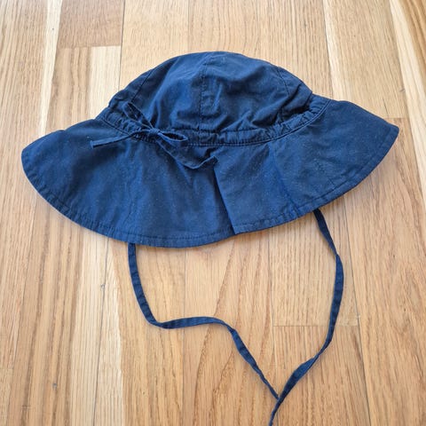 Name it siisti siniharmaa aurinkohattu 6-9kk (45/47cm), korvaläpät sisäpuolella suojaavat tuuleltakin.