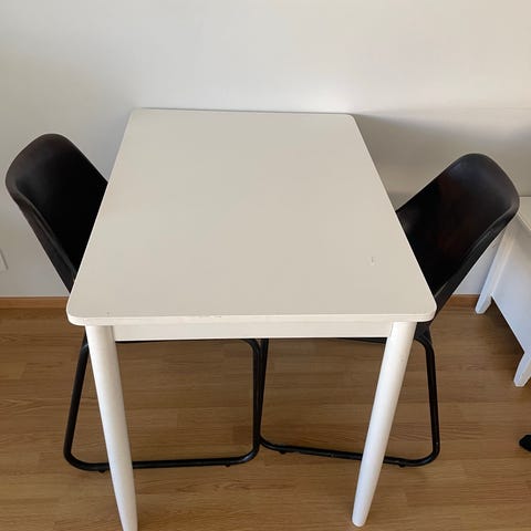 Myydään valkoinen ruokapöytä ja tuolit. Pinnassa kulumisen jälkiä, mutta muuten ihan toimiva setti. Vain nouto, Seppälästä.
