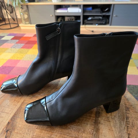 Billi bi:n laadukkaasta nahasta valmistetut nilkkurit. Varressa joustinosa, jonka ansiosta helppo pukea. Itse pidän erityisesti kärkien kiiltonahkaosuudesta, josta tulee vähän chanel-vibat ☺️ Mutta koska kengät ovat kokonaan mustat, efekti on hillitty.
