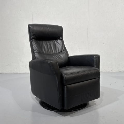 Laadukas IMG Norway Prince malliston recliner nojatuoli. Pyörivä ja keinuva jalusta, selkänoja taittuu alas ja jalkatuki nousee kahvalla. Miellyttävä musta nahkaverhoilu. Tuolissa on mukava istuin ja selkänoja.