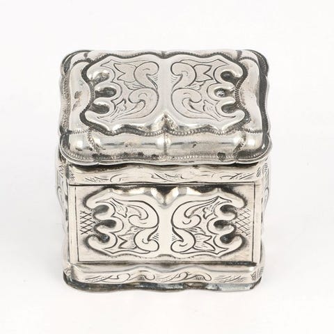 Kuvaus: Erittäin kaunis, suurikokoinen Lodereindoosje, valmistettu 1800-luvun esikuvan mukaan. Varustettu kauniisti kaiverretulla relieffikoristeella.Alkuperä: Schoonhoven, AlankomaatHopeaseppä: J. NiekerkVuosi: 1967Takuumerkit: Leijona II, Minerva M, Mestaremerkki, h.Kunto: hyvässä kunnossaPaino: 31.5 grammaaLaatu: 835/1000Mitat: 4.4 x 3.1 x 4.2 cm*Kuvat ovat osa kuvaustaKohdelistan numero: A-13273Kaikki artikkelit lähetetään rekisteröidyllä postilla.Voit myös noutaa kohteen yhdestä yli 100 toimistostamme Alankomaissa, Belgiassa tai Saksassa.Käy Goudwisselkantoorin (NL ja BE) verkkosivustolla Comptoir de l’Or (BE) tai Goldwechselhaus (DE) löytääksesi lähimmän toimipisteen.Ilmoita Catawiki-tilillä antamasi mieltymykset meille.