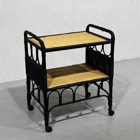 Kaksitasoinen tarjoiluvaunu, jossa on mustat pyörät ja punotut yksityiskohdat. Vaunussa on kaksi hyllytasoa, jotka tarjoavat säilytystilaa. Pintakulumaa, hieman pyörät kuluneet._____________________________________Nyt uniikki mahdollisuus hankkia pala televisiohistoriaa kotiin! Tämä tavara on osa YLE rekvisiittavaraston myyntierää.Suomalainen televisiotuotanto ja Yleisradio elävät mukana ajassa ja tämä vaatii kuratointia myös YLEn ainutlaatuisen kattavissa rekvisiittakokoelmissa. Osana jatkuvaa uudistumista tehdään esinepaljoudesta ajoittain myös poistoja.Nyt sinulla onkin mahdollisuus ostaa omaksesi pala suomalaista televisiohistoriaa Ylen kokoelmista poistettujen esineiden ja huonekalujen muodossa.