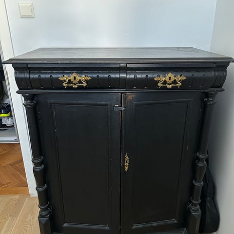 Klassinen tyyli, joka sopii perinteiseen sisustukseen. Kaapissa on kauniit yksityiskohdat ja se edustaa aikakautensa käsityötaitoa.