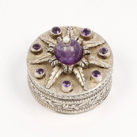 Kuvaus: Kaunis pyöreä rasia rikkaine koristeineen, violetin sävyisiä kiviä ja siemenhelmen koristamanaPeräisin: EuroopastaHopeaseppä: tuntematonVuosi: 1960–1970Takuumerkintä: 900, mestertunnusKunto: hyväkuntoinenPaino: 46,5 gLaatu: 900/1000Mitat: 3,8 x 4,5 cm*Kuvat ovat osa kuvaustaKavelin numero: A-13356Kaikki tuotteemme lähetetään rekisteröidyllä postilla.Voit noutaa erän myös yhdessä yli sadasta toimistostamme Alankomaissa, Belgiassa tai Saksassa.Käy Goudwisselkantoorin verkkosivustolla (NL ja BE) Comptoir de l’Or (BE) tai Goldwechselhaus (DE) nähdäksesi lähimmän toimipaikan.Ilmoita toiveesi Catawiki-tililläsi.