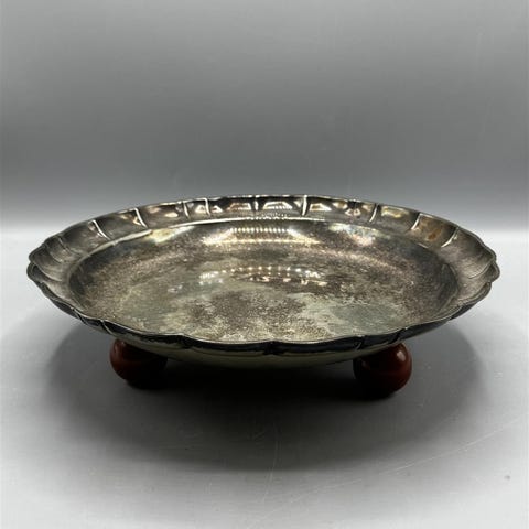 Koristeellinen hopeoitu jalallinen vati, jossa on kauniit kukkakuviot. Vati on valmistettu alpakasta ja siinä on kolme erikoista, pallomaista jalkaa.