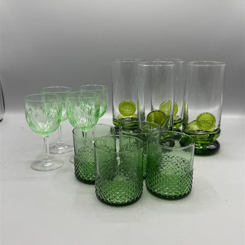 Kokoelma vihreitä vintage laseja, jotka sisältävät liköörilaseja, matalia vesilaseja ja korkeita laseja. 1) Humppilan lasi Kievari malliston korkea lasi EG (Enso Gutzeit) merkinnällä. Design Matti Halme2) Vihreät vintage juomalasit 3) Iittala Emma liköörilasi, yhden lasin reunassa pieni vekki