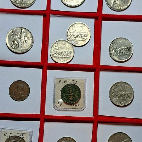 Italia.Kuningaskunta Vittorio Emanuele III°. 13 kolikon erä.lira 1922,1923,1924 ja 1928. BB:stä SPL:iin50 centesimi leoni 1919 sileä ja reunakuvioitu MB:stä BB:hen1920 sileä 1921 reunakuvioitu.10 centesimi 1919..... plus 2 c,1915 ae2 x 20 cent.1920Kuten kuvassaG10.