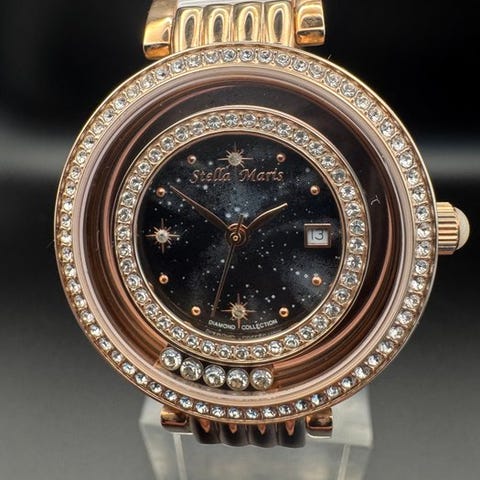 Stella Maris Diamond kronografikello, jossa timantteja ja Swarovski-kiviäKellon tiedot:kvartsikoneistoruostumattomasta teräksestä valmistettu kotelo IP-rosegold -pinnoituspremium-keraminen ranneke ruostumattomasta teräksestä valmistetulla perhoslukolla5 timanttia kellotaulussa (4 × 1,1 mm, 1 × 1,0 mm)retrogradinen päiväys286 Swarovski-kivetäerityinen kotelon muotoiluvedenkestävyys 5 ATM astisafiirilasikotelon halkaisija: noin 38 mmrannekorin kokonaispituus noin 19 cmRajoitettu painosruuvein kiinnitetty ruostumattomasta teräksestä takakansiAlkuperäinen laatikkoerinomaisessa kunnossa, käyttämätönKuvat kuuluvat kuvausta