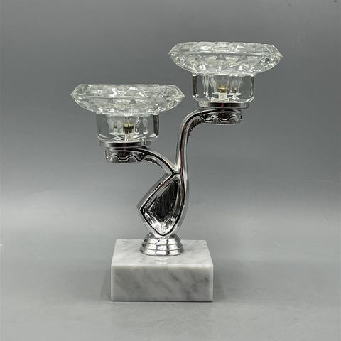 Kaksiosainen kynttilänjalka, jossa on koristeelliset lasiset pidikkeet ja marmorinen jalusta.