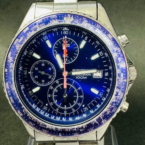 DescriptionCase: 41 mm (diameter excluding crown) x 46 mm (lug to lug)Dial: Kellotaulu: musta kellotaulu, mustat pienkellotaulut, hopea-/valkoiset merkit ja osoittimetDate: Päiväys: Quickset toimiiChronograph: Käynnistyy, mutta piensekuntiosoittimen osoitin ei toimi kovin hyvinCrystal: Hardlex-lasiStrap: AlkuperäinenLug width: 20 mmLength including watch head: 17 cmService history unknown. Remaining battery capacity unknown. Insured shipping via the following channels:Local shipping: Paikallinen rekisteröity postilähetysInternational shipping: DHL ExpressIMPORTANT NOTES!! PLEASE NOTE BEFORE BIDDING!!1. The watch is sold on an as is condition. Unless otherwise stated, no warranty is provided and no claims for timekeeping accuracy, water resistance etc. will be allowed or entertained.2. The buyer shall be responsible for additional customs and/or value-added taxes that may be levied by the tax authorities of each country. Therefore, please check with the relevant authorities if you are unsure and bid accordingly. In the event the buyer fails to take delivery due to non-payment of taxes payable, the buyer shall still be liable for all shipping, customs clearance and other admin costs incurred.3. In the event of cancellation at the buyer’s discretion after shipment, the buyer shall be liable for all return shipping charges, admin and custom charges payable to ship back and re-import the watch.4. International transit (excluding customs clearance and last mile delivery) usually takes up to 2 weeks but may take longer depending on the country and location, public holidays, war situation in Ukraine, global pandemic situation and so on.5. Please note also that we have no influence or control over how fast the customs authority of each country processes the parcel upon arrival in your country. Therefore, please check with your customs authority/postal service once the item arrives in-country.