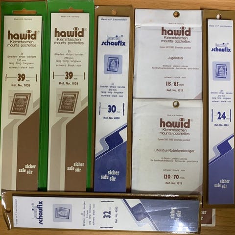 30 erilaista pakkausta, erikokoisia tarroja ja kiinnitystaskuja mustapohjaisella taustalla Hawid ja Leuchtturm. Uudet, alkuperäisessä pakkauksessaan ehjinä. Suositushinta 300 euroa.