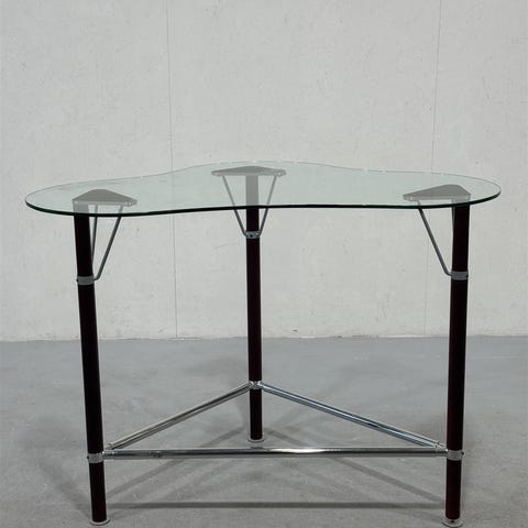 Kolmijalkainen pöytä, jossa on epäsäännöllisen muotoinen lasikansi. Pöydän jalat ovat metallia ja lasikansi on kiinnitetty metallisilla tuilla.