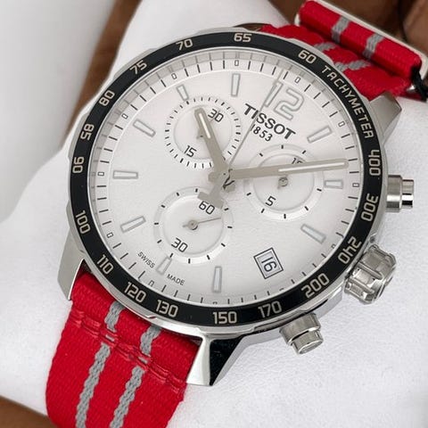 Tissot - Quickster Chronograph T095.417.17.037.12Kotelo: ruostumaton teräsKoneisto: sveitsiläinen ETA Quartz Kellotaulu: hopea/valkoinenHalkaisija: 42 mm (ilman kruunua)Lasi: safiirilasiHihna: alkuperäinen punainen tekstiilinen hihnaRanteen ympärys: n. 21 cmKunto: Uutena!Takuu: 1 vuosi "de Horlogemeesters"Toimitus: toimitetaan alkuperäisessä (lokaku) laatikossa + aittocertifikaatti "de Horlogemeesters." Toimitus: tämä kello lähetetään kirjatulla toimituksena (DHL-express).