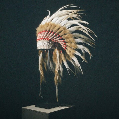 Remake Indian headdress made with real feathers.An Indian headdress, often referred to as a feathered headdress or war bonnet, is a traditional headpiece worn by various Indigenous peoples of North America, particularly among Native American Plains tribes such as the Sioux, Cheyenne, and Crow. These headdresses typically worn to symbolize important achievements or social status.The most iconic of these headdresses are those adorned with long feathers, often eagle feathers, which are considered sacred in many Native American cultures. Each feather added to the headdress represents a specific accomplishment or act of bravery, such as acts of valor in battle or a significant leadership role within the community.It's important to recognize that headdresses are deeply meaningful and symbolic, and their use is a part of cultural and spiritual traditions. They are not to be worn as costumes or for fashion, as doing so without understanding the significance can be seen as disrespectful or inappropriate, as it trivializes a sacred part of Native American heritage.APPROXIMATE DIMENSIONS including standHeight: 80 cm Width: 68 cmDISCLAIMERS: > Please be aware these pictures have been taken in a dark studio, colors may vary depending on the environment. > Included is a 12cm stand extension.> THE WEIGHT MENTIONED IS INCLUDING PACKING MATERIAL.THE SHIPMENT- The item will be sent with a Track & Trace code via DHL Parcel, DPD or postNl. The tracking will be updated in your Catawiki lot once your parcel has been dropped off.- Please check regularly to avoid your parcel being returned to us, in which case the buyer will be responsible for the shipping costs of the 2nd shipment.- For tracking to Spain and Portugal please use this link and add the tracking number from your Catawiki lothttps://clientesparcel.dhl.es/LiveTracking/HomeWE DO NOT COMBINE SHIPPING!!!If you have any questions about your parcel please contact us using the Catawiki message service. We will try to reply within 3 working days.