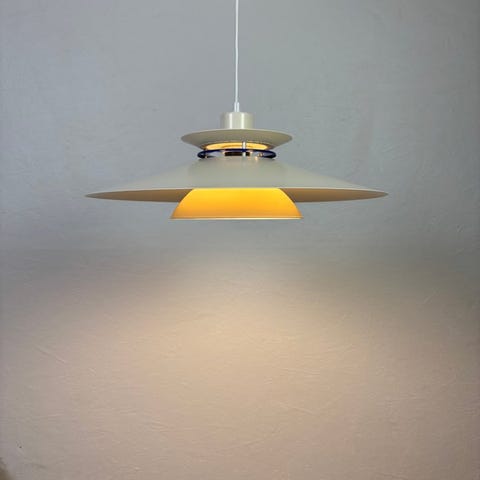 Tanskalainen riippuvalaisin, jossa on klassinen monivarjostinjärjestelmä.Vintager-lamppu, jonka on valmistanut Design Light A/S.Monivarjostinjärjestelmä levittää valon huoneeseen siten, että polttimo ei näy.Käytön merkkejä.Se käyttää aitoa “normaalia” E27-polttimoa ja on käyttövalmis.läpimitta: 45 cm.