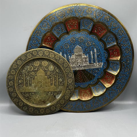Kaksi koristeellista tarjotinta, joissa on yksityiskohtainen kaiverrus. Kuvioissa on esitetty tunnettu Taj Mahal rakennus Intiasta ja kukkakoristeita. Tarjottimet ovat eri kokoisia, suurempi on halkaisijaltaan noin 40 cm ja pienempi noin 25 cm.